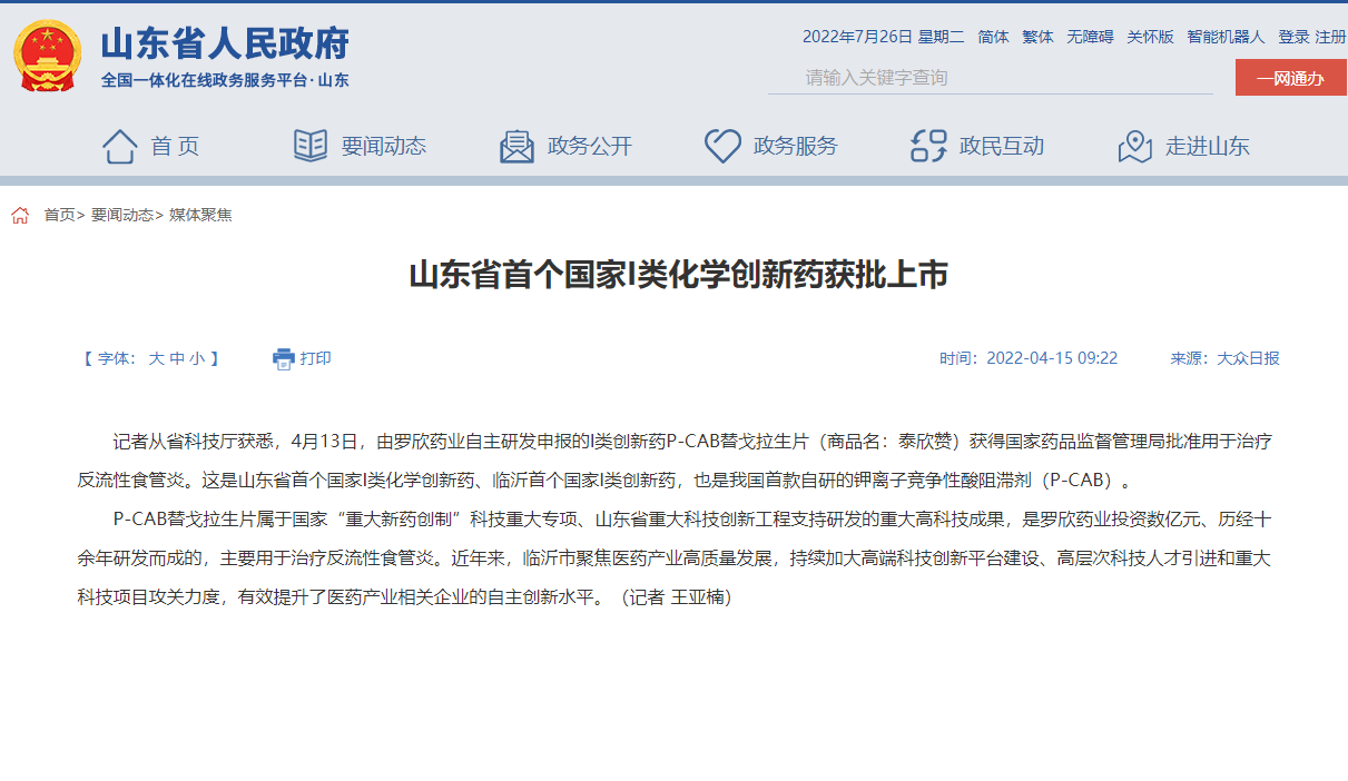 山东省人民政府报道 | 山东省首个国家I类化学创新药获批上市