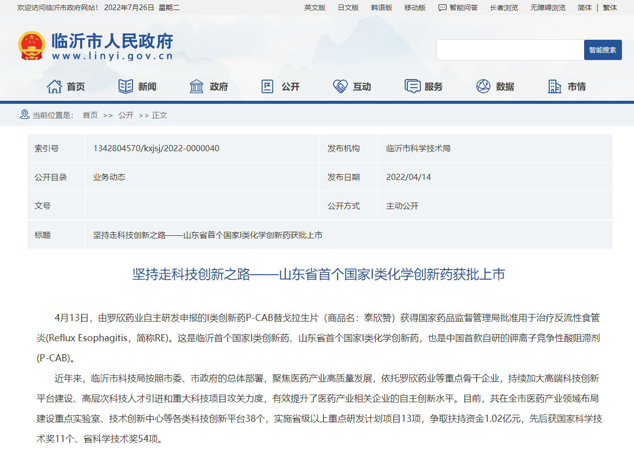 临沂市人民政府报道 | 坚持走科技创新之路——山东省首个国家I类化学创新药获批上市