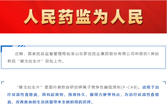 4月13日,由罗欣药业自主研发申报的I类创新药P-CAB替戈拉生片(商品名:泰欣赞)获得国家药品监督管理局批准用于治疗反流性食管炎(Reflux Esophagitis,简称RE)。这是临沂首个国家I类创新药、山东省首个国家I类化学创新药,也是中国首款自研的钾离子竞争性酸阻滞剂(P-CAB)。