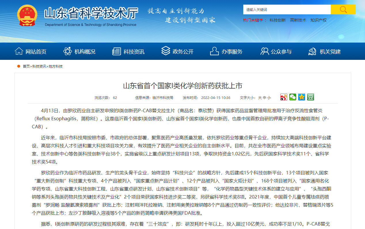 山东省科学技术厅报道 | 山东省首个国家I类化学创新药获批上市