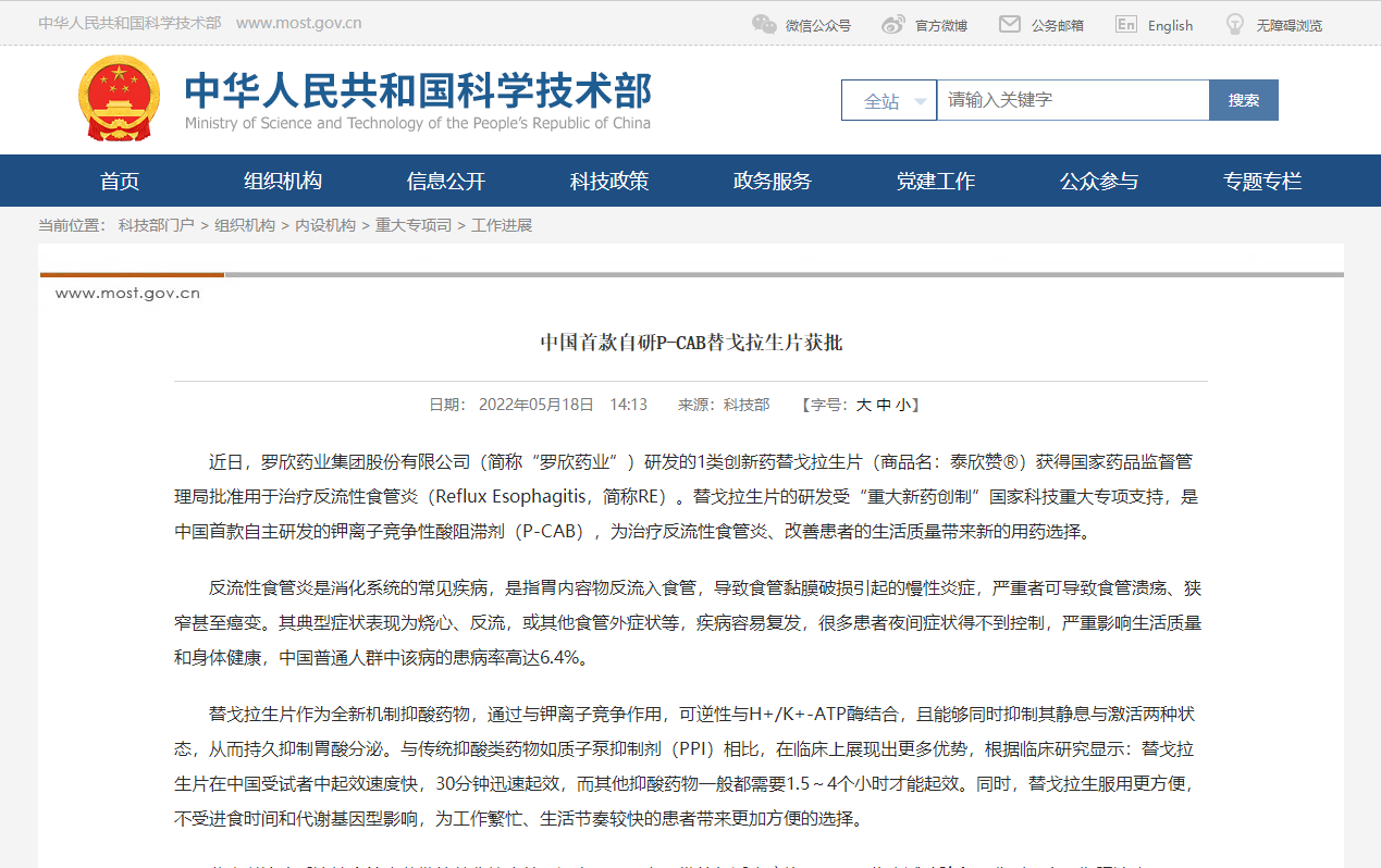 中国科技部 | 中国首款自研P-CAB替戈拉生片获批