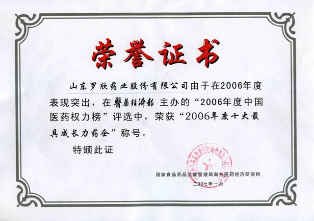 由于2006年年度表现突出,在国家食品药品监督管理局南方医药经济研究所“2006年中国医药权力榜”评选中,荣获“2006年最具成长力药企”称号。
