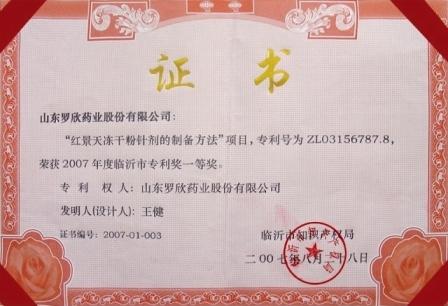 山东罗欣药业股份有限公司“红景天冻干粉针剂及其制备方法”项目,荣获2007年度临沂市专利奖一等奖,山东省专利奖三等奖。