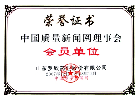 2007年12月,山东罗欣药业股份有限公司再度荣获由中国质量新闻网颁发的“中国质量新闻网理事会会员单位”荣誉证书。