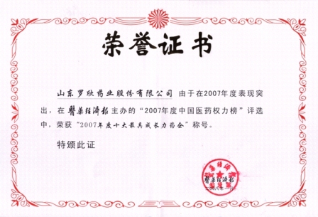 我公司在获得“2006年度十大最具成长力药企”的基础上,再次在医药经济报主办的“2007年中国医药权力榜”评选中,荣获“2007年度十大最具成长力药企”称号。