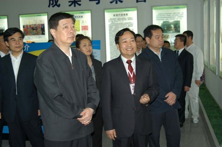2008年4月7日,山东省委书记姜异康(前排右三)在山东省委常委、秘书长王敏(前排右一)、临沂市委书记连承敏(前排右四)陪同下视察罗欣药业。罗欣药业董事长刘保起(前排右二)向姜书记介绍了公司发展情况。