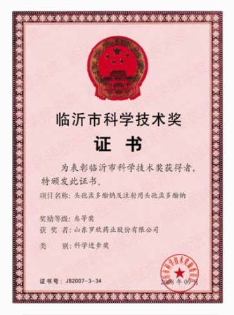 罗欣药业始终坚持“科技兴企”的战略方针,加大科研投入,不断推出高科技含量、高质量、高附加值的“三高”产品。2008年9月,公司研发的产品硫酸头孢匹罗及注射用硫酸头孢匹罗、头孢硫眯及注射用头孢硫眯的新技术获得临沂市科学技术进步奖二等奖,头孢孟多酯钠及注射用头孢孟多酯钠、头孢克肟的新技术获得临沂市科学技术进步奖三等奖。