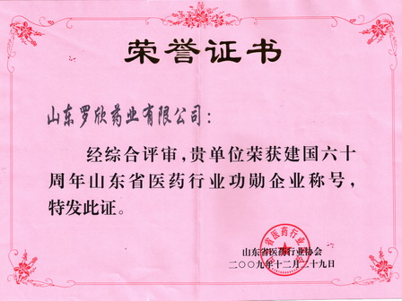 2009年12月,山东罗欣药业股份有限公司被山东省医药行业协会评为建国六十周年山东省医药行业“功勋企业”。