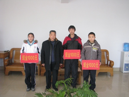 上图为罗欣集团工会主席张祥军代表罗欣集团向罗庄一中杨传栋(左二)、陈丽泉(左一)、高亚南(左四)3名贫困生捐赠助学金时的情景