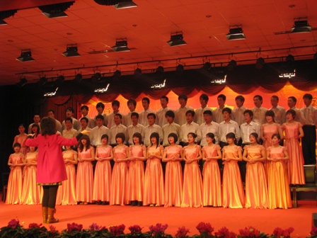 上图为联欢会上员工大合唱《罗欣之歌》