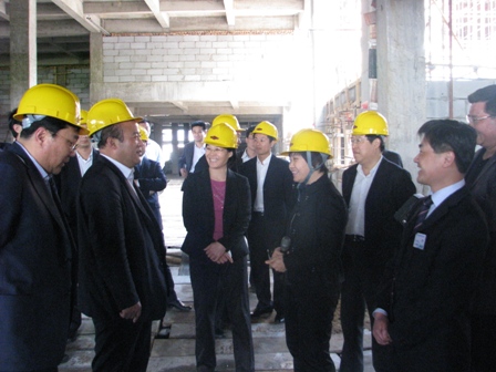 上图为公司总经理李明华(左二)在项目建设现场向市委书记、市人大常委会主任张少军(前排右二)汇报项目建设情况。