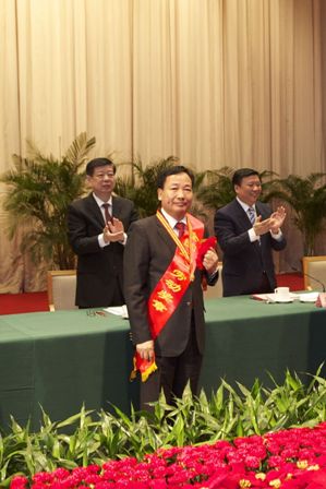 图为全国五一劳动奖章获得者---公司董事长刘保起同志在颁奖仪式上的情景
